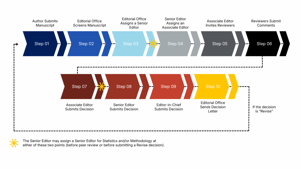 The typical peer review workflow involves a chain of editors that includes the Editor-in-Chief, a Senior Editor, and an Associate Editor. The Editorial Office screens manuscripts to ensure they roughly follow our Instructions for Authors, then assigns a Senior Editor based on manuscript topic. Senior Editors are responsible for triaging assignments to the appropriate Associate Editor, who then will handle the peer review process. After peer review is completed and the Associate Editor has submitted a recommendation, the Senior Editor signs off on the Associate Editor’s recommendation, which is then signed off on by the Editor-in-Chief. As the final step, the Editorial Office proofreads and sends the decision letter to the authors.